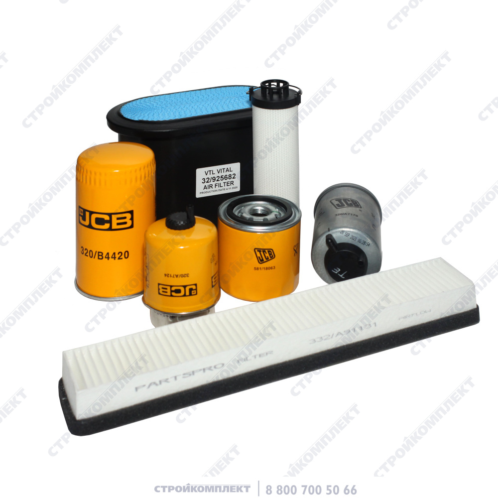 Комплектность | Фильтр масляный 320/B4420 (JCB); Фильтр топливный грубой очистки 320/A7124 (JCB); Фильтр топливный тонкой очистки 320/A7170 (JCB); Фильтр гидравлический 32/925346 (S-PARTS); Фильтр коробки передач 581/M8563 (JCB); Фильтр воздушный наружный 32/925682 (S-PARTS); Фильтр отопителя 332/A9113 (S-PARTS) |